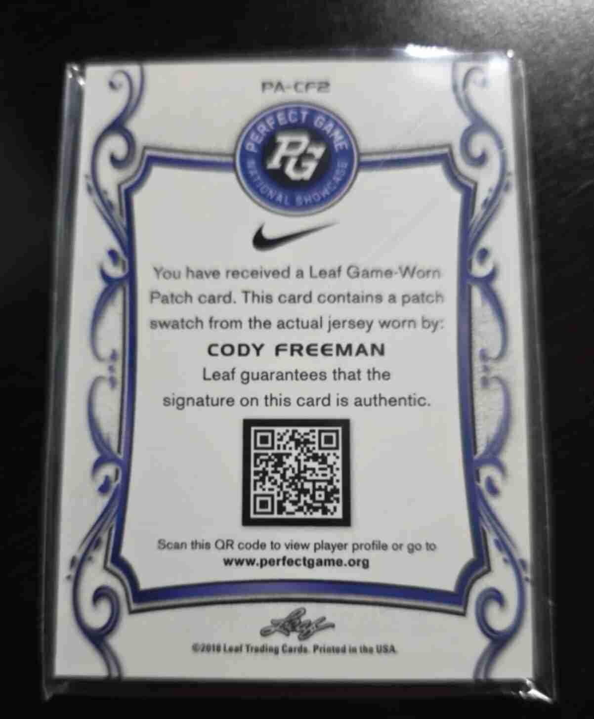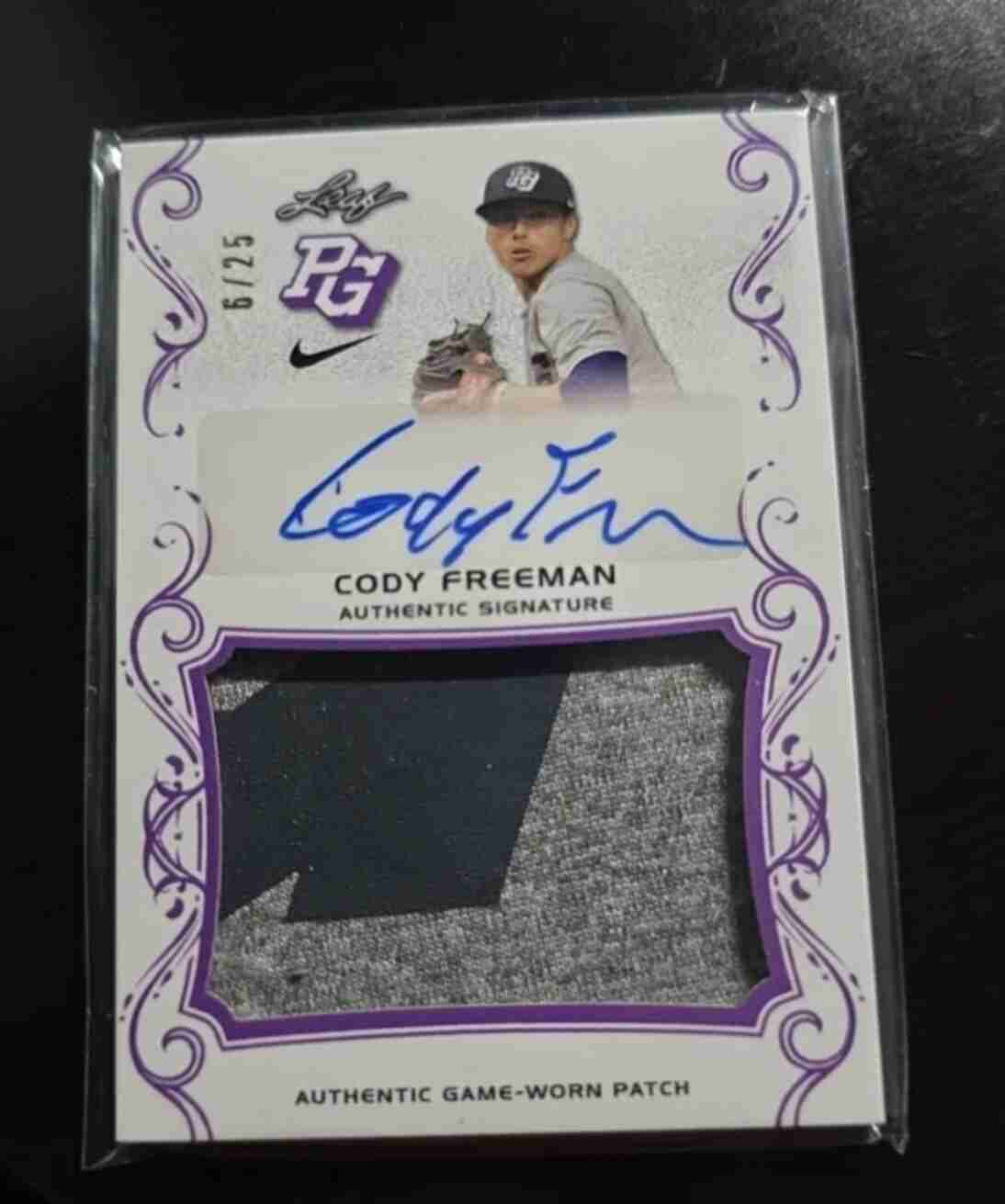 CODY FREEMAN 2018 AUTO LEAF PERFECT GAME ROOKIE Patch Autograph Game Worn #6/25. Card is in Nr-Mt condition.