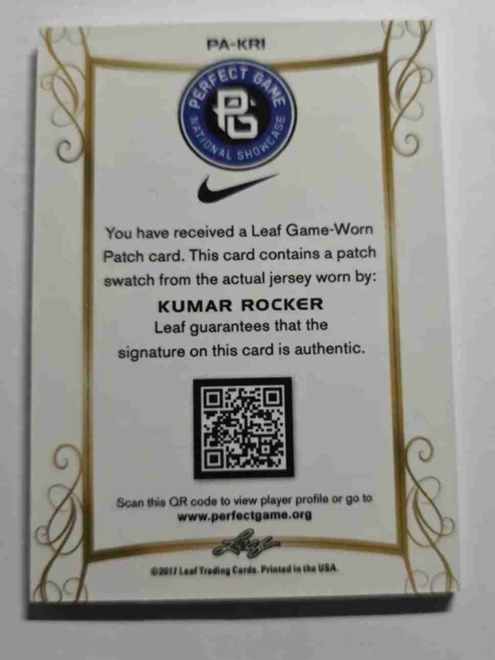 KUMAR ROCKER 2017 Leaf PERFECT GAME AUTOGRAPH PATCH #18/20 VANDERBILT RANGERS. Card is in Nr-Mt