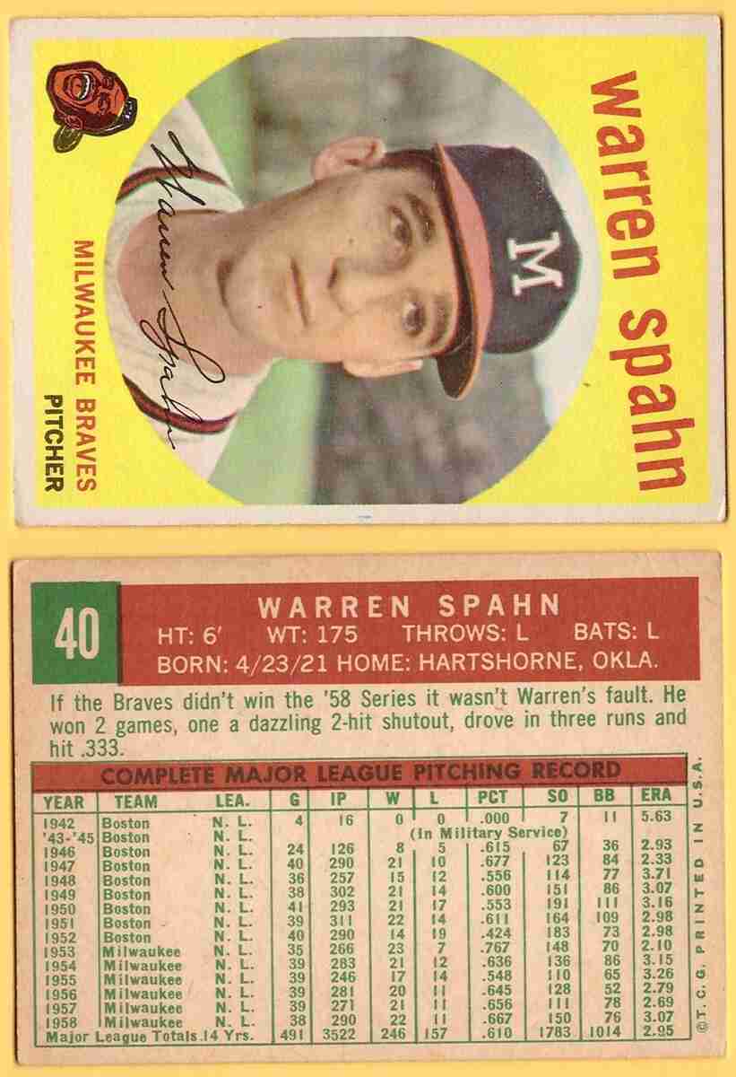 1959 Topps #40 Warren Spahn <=====================>[SL324] refer to pictures for condition/grade of card =================================================