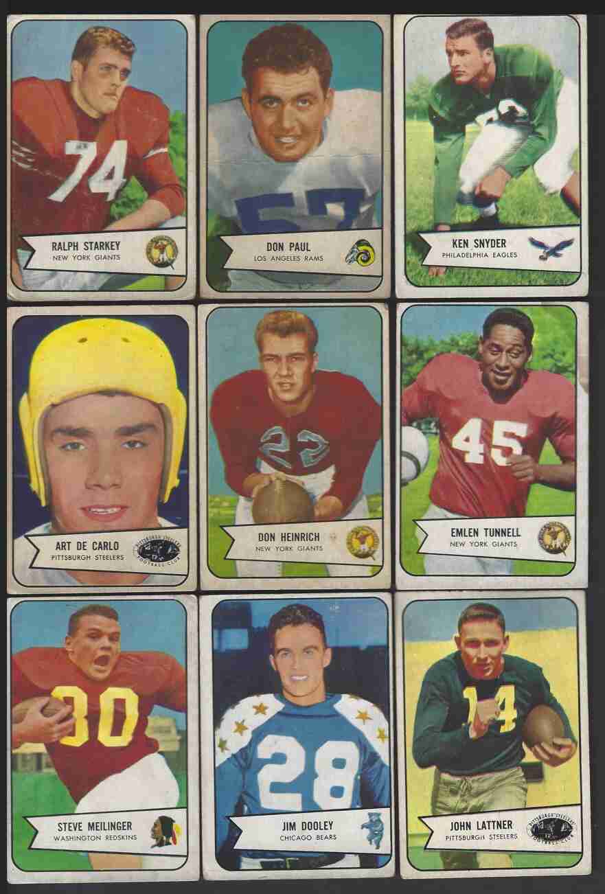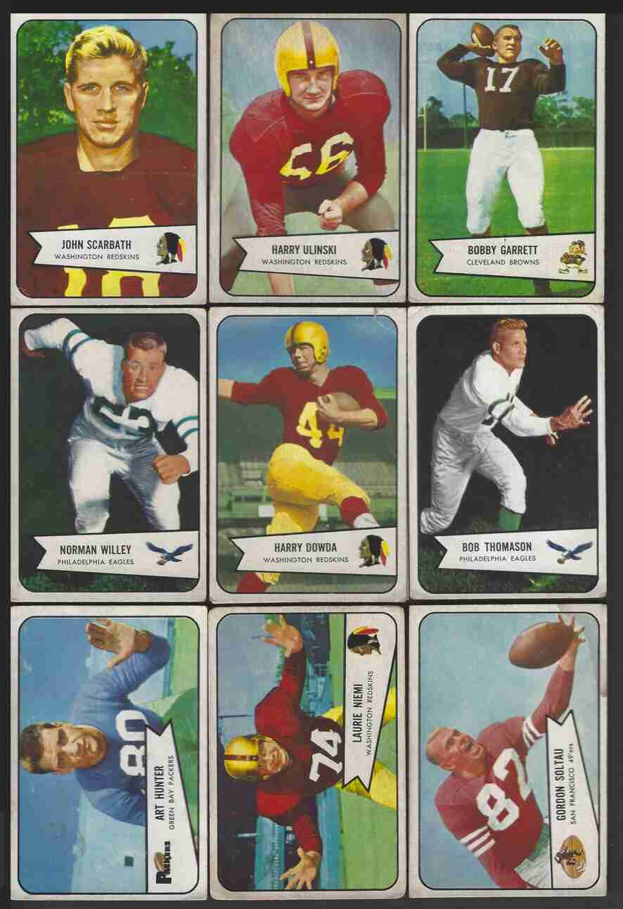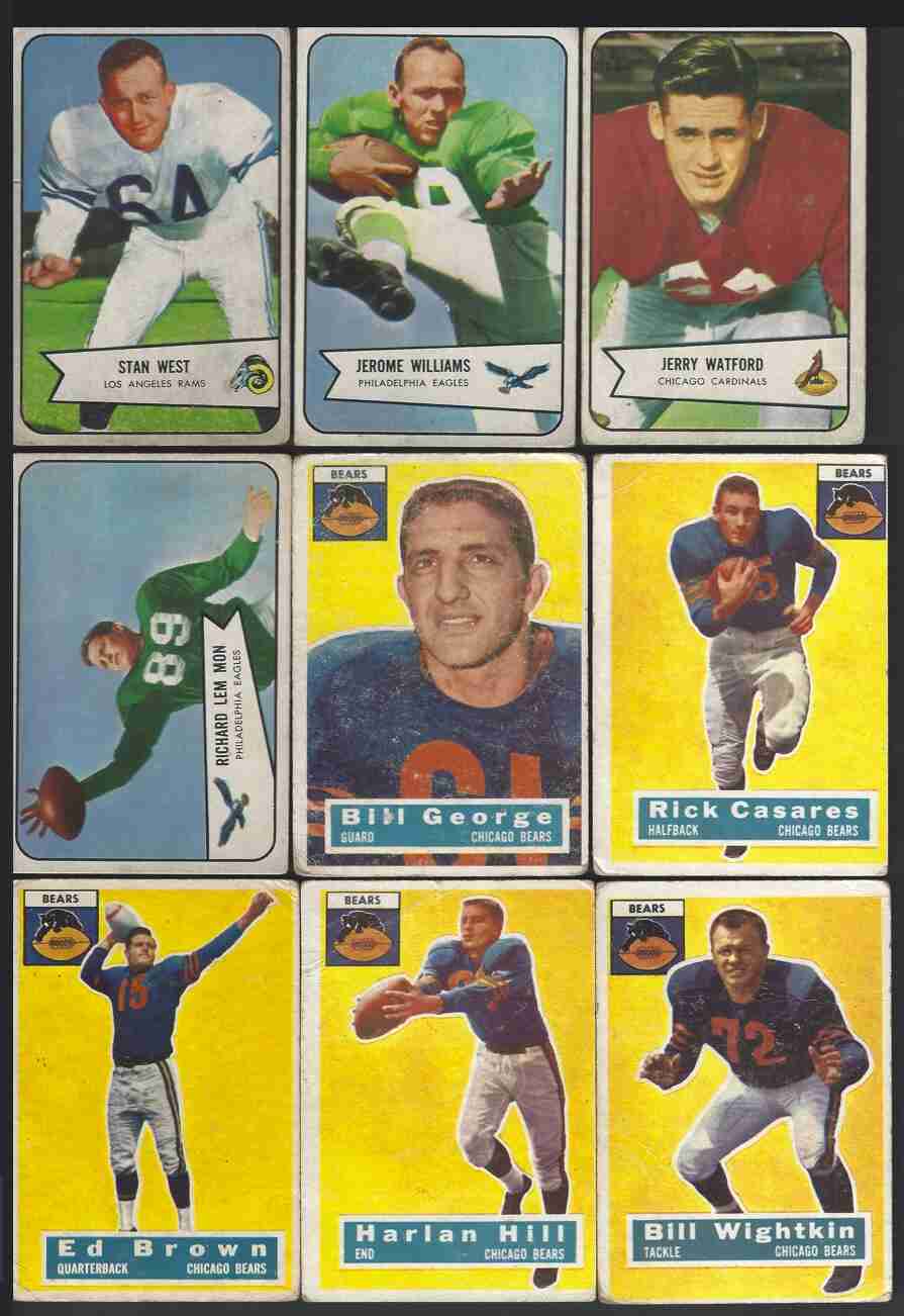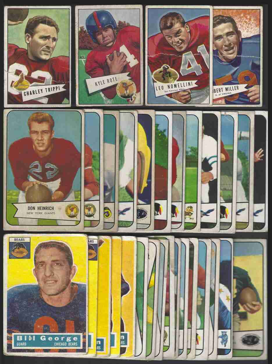1950's Football Lot (32). 1952 Bowman Small (4) -#12(HOF),27,28(RC),125(HOF). 1954 Bowman (23) -#3,15,16,21,27,33,45,58,63,67(SP),68(SP),69(SP),71(SP), 92(SP-RC),101,102(HOF),103,104,107,114,110,121,128(RC). 1956 Topps -#23,35, 47(RC-HOF),59,107. Lot includes Hall of Famers, Rookies & scarce SP's. This is a lower-grade lot - corner wear, wrinkle/crease, paper loss, stain. Decent lot if you don't mind off-condition cards. Please review scans carefully for condition.