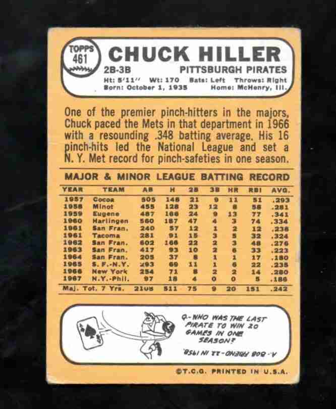 1968 Topps Semi Hi # 461 CHUCK HILLER Pitt. Pirates