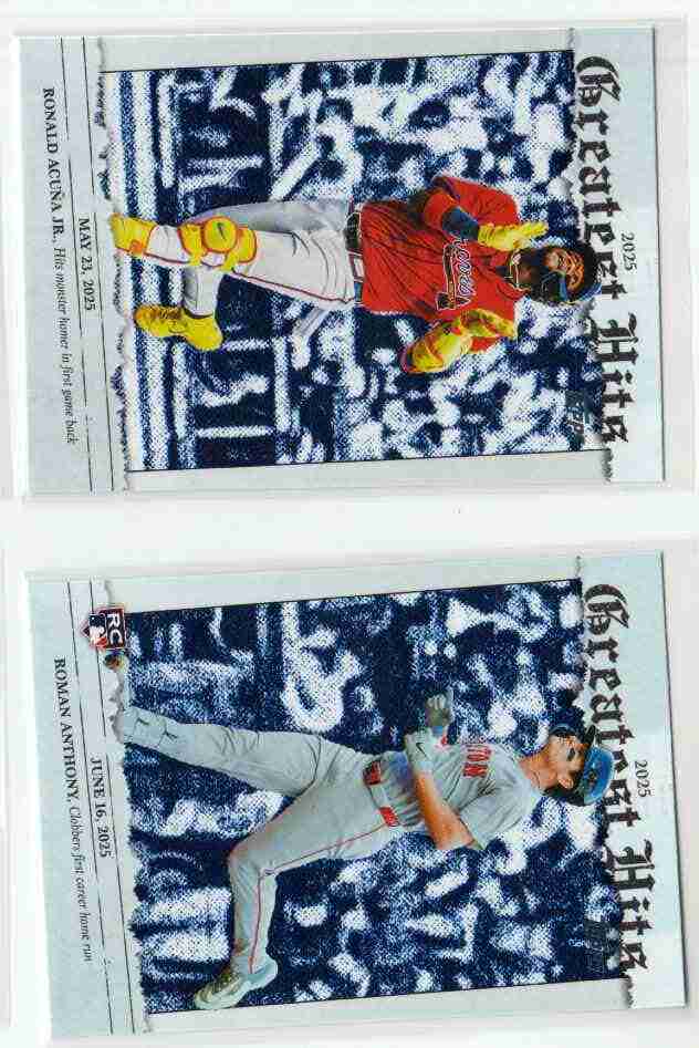 Please take a look at the photos for details on the cards' condition. The cards you are bidding on are the cards pictured. This auction is for 2 2026 Topps Series 1 2025 Greatest Hits inserts featuring Roman Anthony and Ronald Acuna Jr. View the image for a complete listing. You can use your judgment on the grade of the cards. If you have any questions or require more detailed photos, please don't hesitate to ask. Note: The shipping price shown is for PWE. The card will ship with a tracking number if the final auction price exceeds a certain dollar amount (or if it is combined with the appropriate number of other completed auctions). Otherwise, the card will be shipped PWE. Thank you!