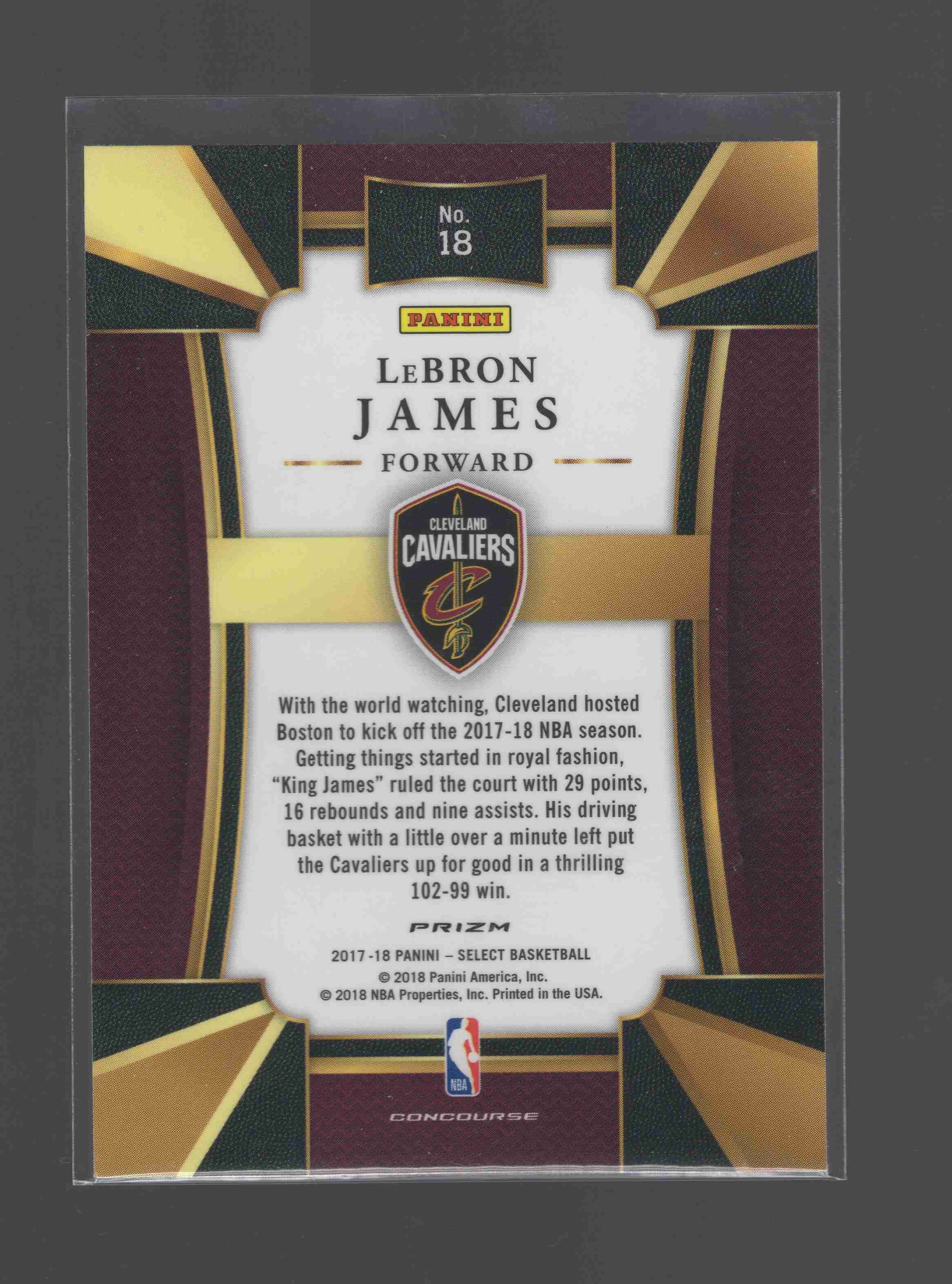 LeBron James 2017-18 Select Concourse Scope Prizm #18. Ships bubble mailer with tracking.