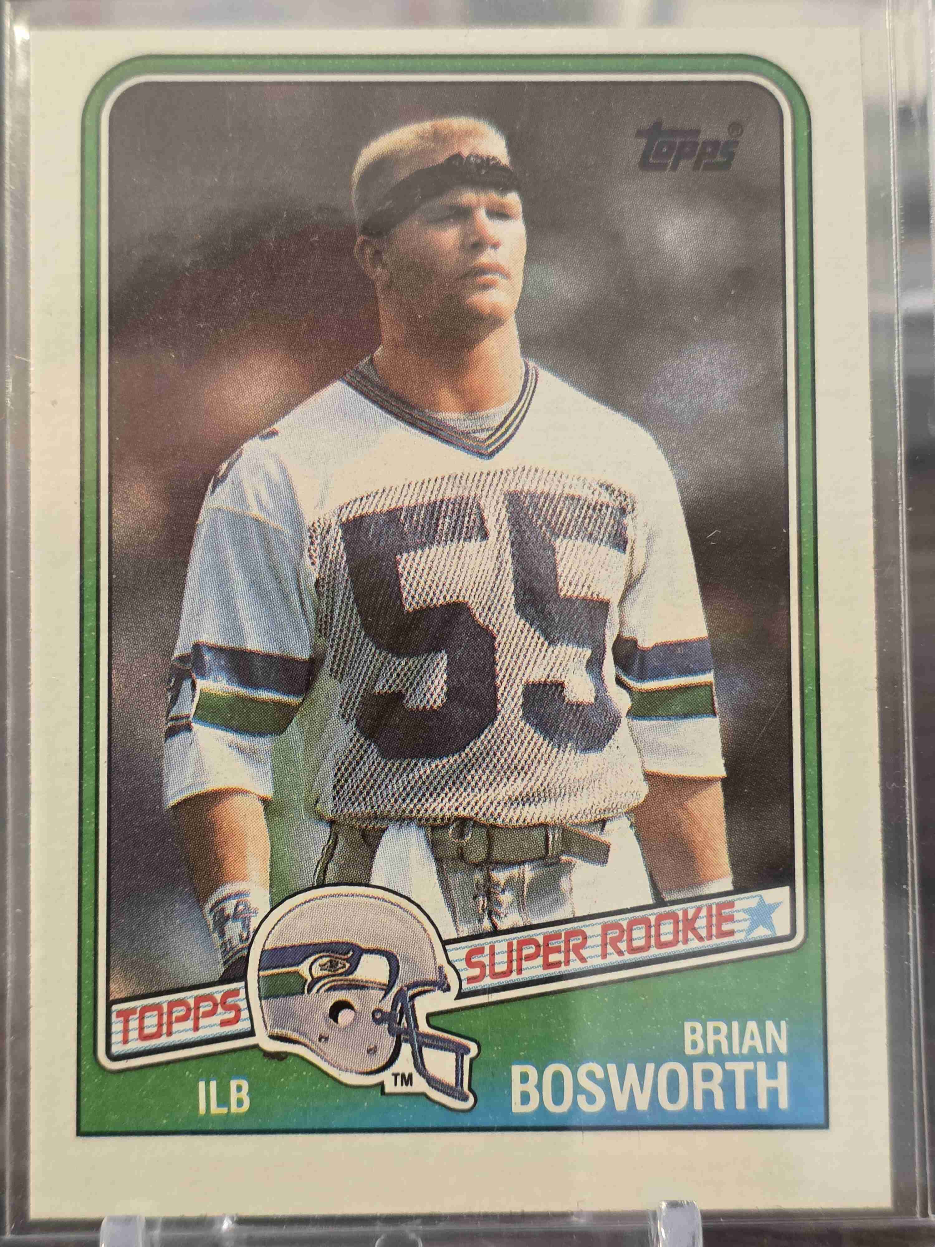 The product is a Brian Bosworth 1988 Topps Rookie Card #144 featuring the player from the Seattle Seahawks in the National Football League (NFL). Made of card stock, this original sports trading card is a piece of football history from the 1988 season. Manufactured by Topps in the United States, this English-language card showcases the rookie player in his early years with the Seahawks. A classic addition to any sports memorabilia collection, this card captures a significant moment in the career of Brian Bosworth.